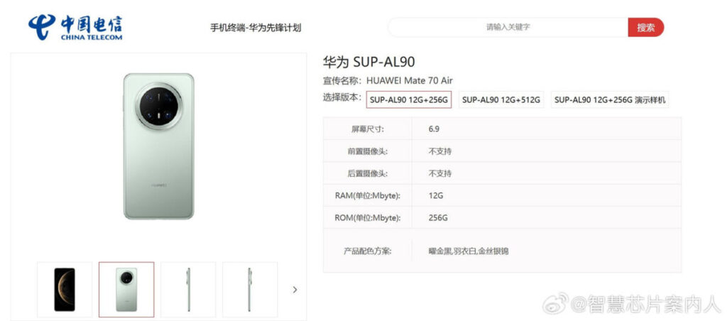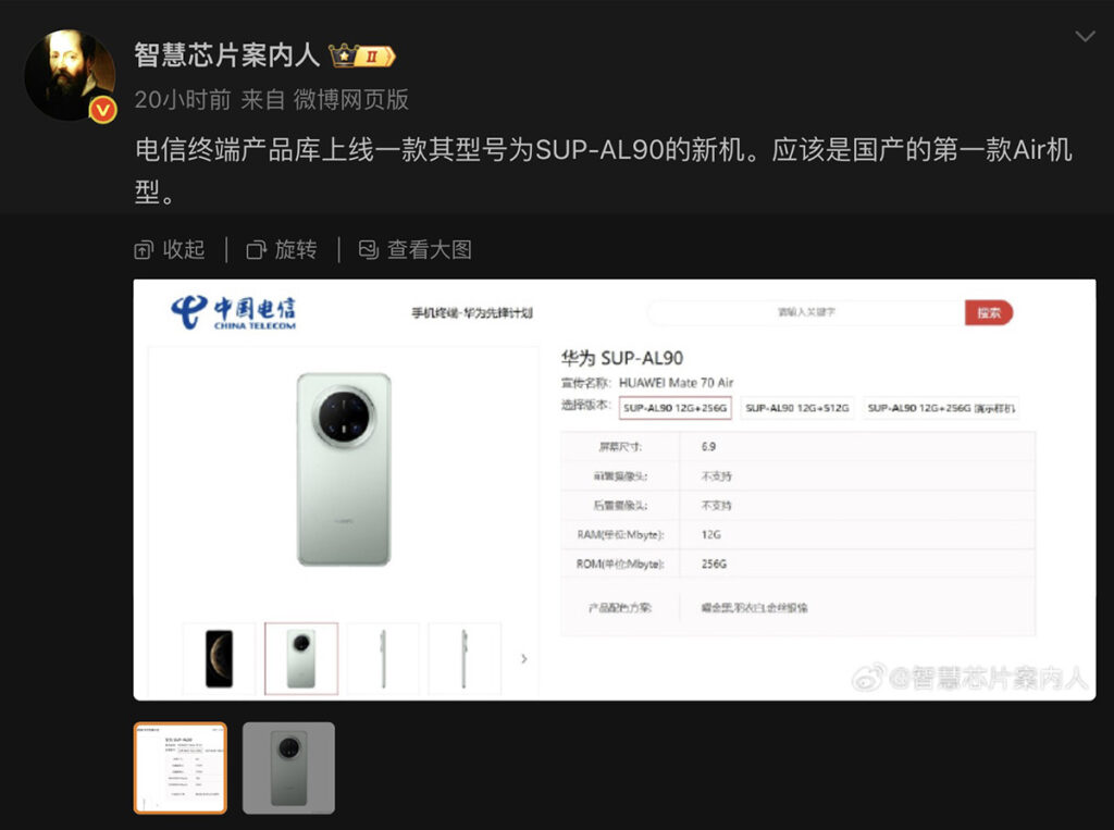 【MOBILE】早前流傳華為或新增型號 SUP-AL90 機型,較早前被確認已錄入中國電信產品資料庫,其正式名稱為 HUAWEI Mate 70 Air 手機。