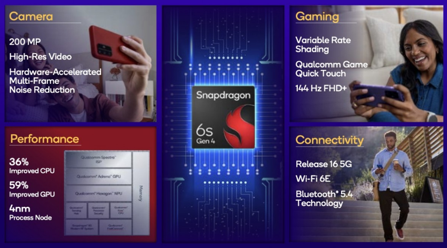 在周邊支援上,Snapdragon 6s Gen 4 同樣與時並進,最高支援 12GB 的 LPDDR5X 記憶體及 UFS 3.1 儲存規格,確保資料讀寫迅速流暢。影像方面,整合的 Spectra ISP 可驅動高達 2 億畫素的巨型感光元件,並支援 2K 解析度影片錄製。