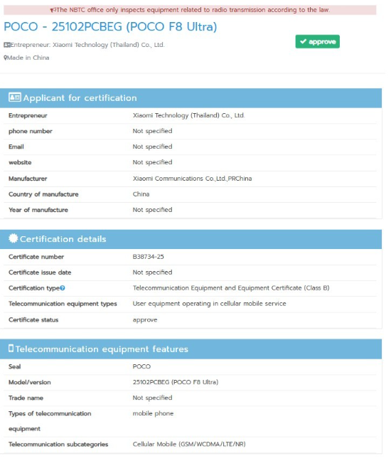 【MOBILE】手機市場競爭激烈,一年兩旗艦似乎將成新常態!POCO F7 Ultra 今年三月才剛亮相,其後繼機型 F8 Ultra 竟已悄悄通過泰國 NBTC 認證,型號 25102PCBEG 正式曝光。