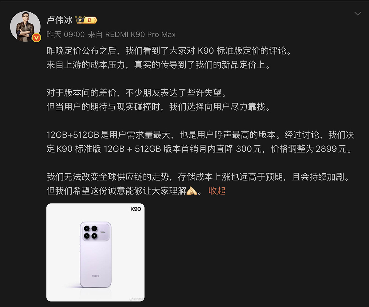 原本有說法指,REDMI K90 標配 12+256 跟 12+512 版本,價差達 600 人民幣會否定價太高,不過小米合伙人盧偉冰隨即宣佈,該型號首月直降 300 人民幣。