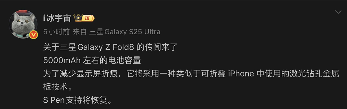 同期爆料人又透露品牌下代大摺 Galaxy Z Fold8 資訊,據透露其電量或有望增至 5,000mAh 左右、用上近似 iPhone Fold 防摺痕技術、同時加回 S Pen 筆控。