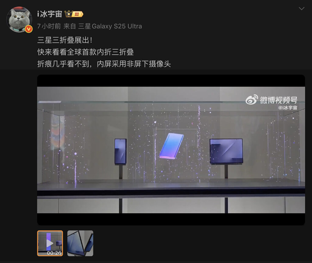 爆料達人 Universe Ice 在微博帳號展示了 Galaxy Z Trifold 的渲染圖、跟 K-Tech 會場實機演示短片,其中 Z Trifold 渲染圖可看到內外屏均採實體開孔設計。