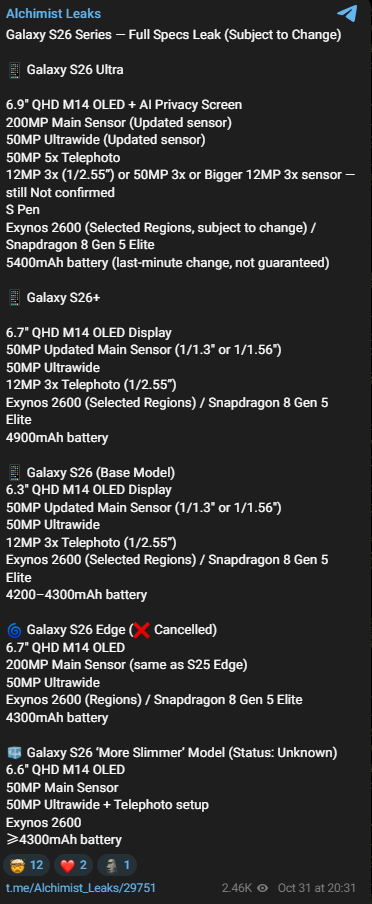 全系列將根據不同市場區域,配備 Snapdragon 8 Elite Gen 5 或 Exynos 2600 處理器。雖然消息來源尚未公開,但其描述的詳細程度令人懷疑可能來自 SAMSUNG 內部資料。不過需要注意的是,近期關於 Galaxy S26 Edge 與 Galaxy S26 Plus 的傳聞確實存在不少矛盾之處,讀者仍需保持審慎態度。
