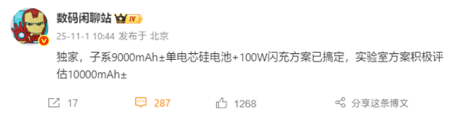【MOBILE】近日數碼博主「數碼閒聊站」透露,某品牌旗下子系列已成功研發約 9000mAh 的單電芯硅電池,並支援 100W 閃充,甚至實驗室中正在積極評估容量達 10000mAh 左右的進階方案。