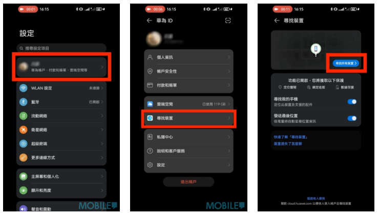 要使用 HUAWEI 手機「尋找裝置」工具,可在設定頁點擊使用者頭像,在「華為 ID」分頁進入「尋找裝置」工具,於頁面中點擊「尋找所有裝置」。