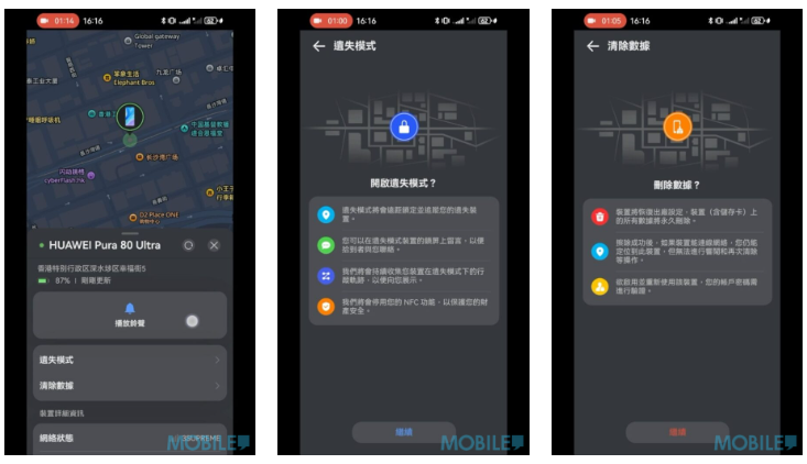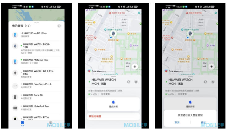 【MOBILE】不同平台為用家意外遺失手機、平板等數碼裝置等情況,均有相應定位功能方便尋回;像 HUAWEI 手機就預載「尋找裝置」工具,可輕鬆尋找同一帳號已登記 HUAWEI 產品,使用方便。