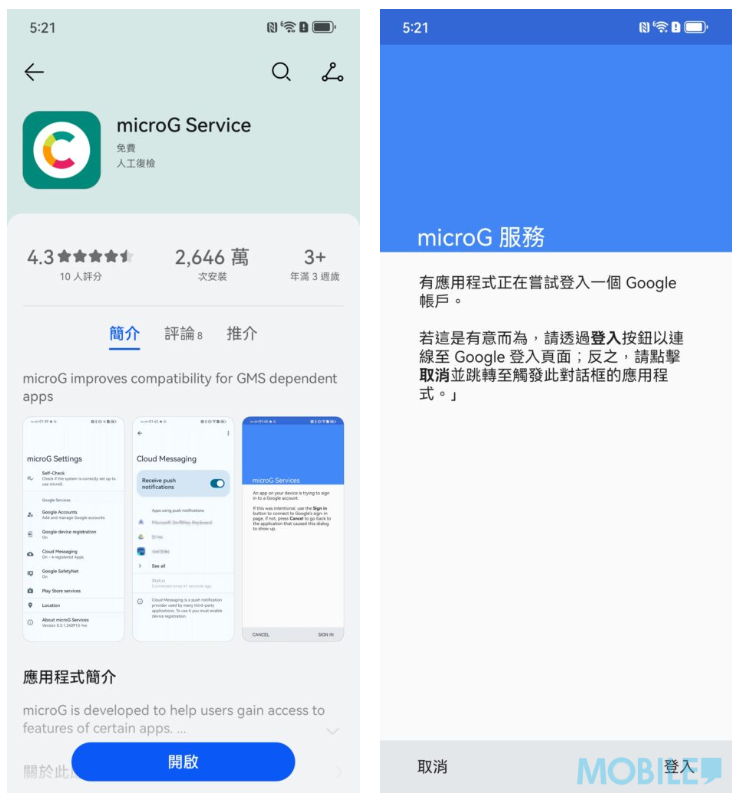 ▲安裝 ”microG” 後可完整使用 Google 服務,與一般支援 Google 手機分別不大。