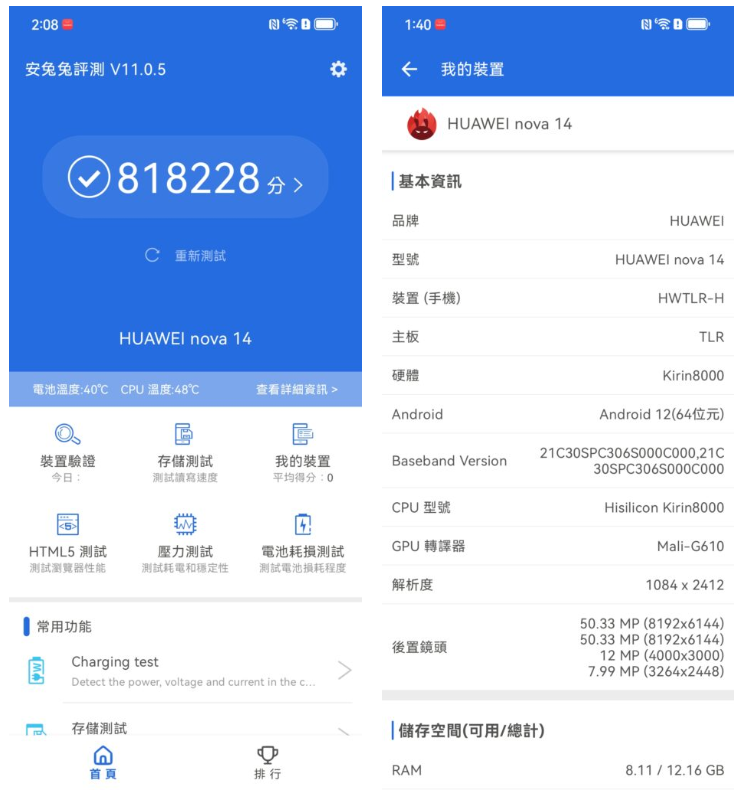 ▲配備 Kirin 8000 處理器的 nova 14 於各項跑分應用成績,都相當不錯。