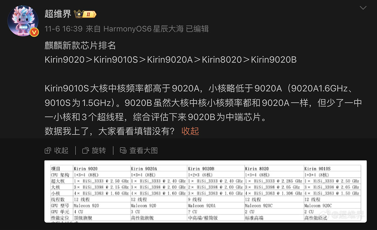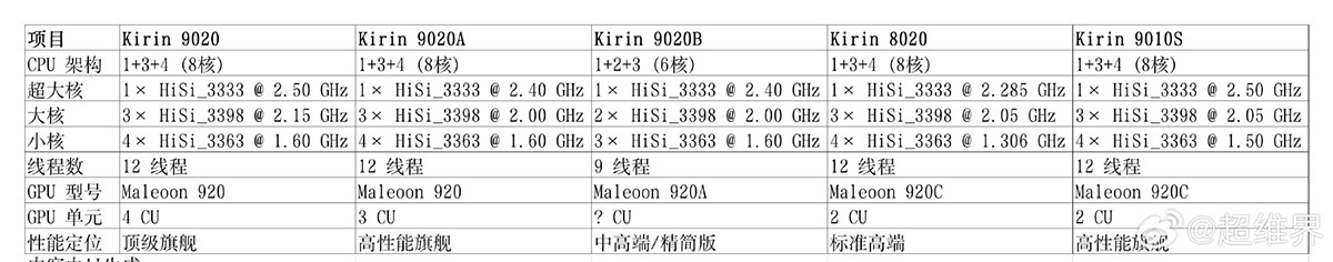 數碼博主「超維界」早前就在微博,介紹了現時 HUAWEI 旗下 Kirin 9020 系列,包括原版、Kirin 9020A 跟 Kirin 9020B 晶片在配置及效能的定位分別。