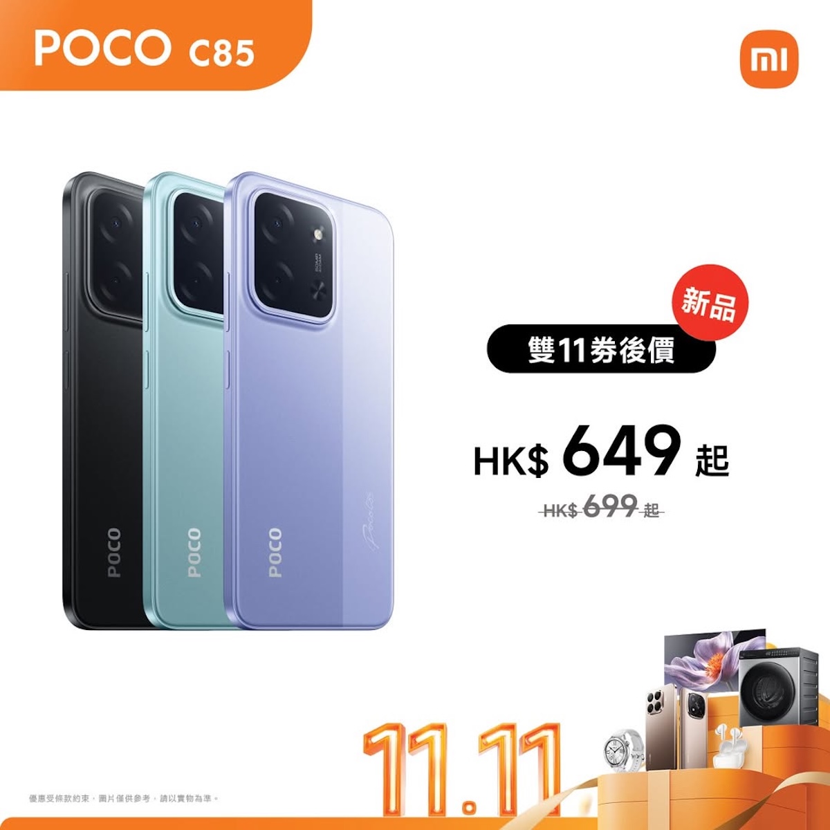 【MOBILE】不少用家趁雙 11 購物節掃平價,本港市場同期亦有不少品牌藉此推出相關優惠。像小米香港就有多款精選產品以特惠價開售,其中 10 月下旬才開售的入門向 POCO C85 手機,亦同樣享有現金券折扣,雙 11 價低至 $650 有找。