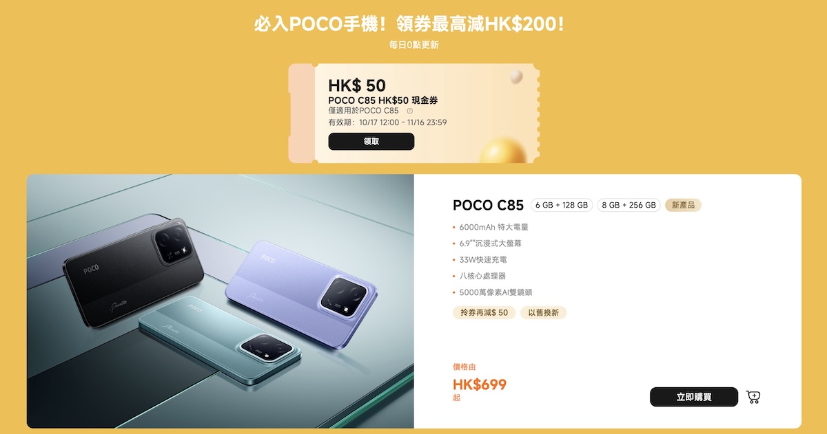 據小米香港 Facebook 帳號資訊,由即日起至 11 月 16 日間,在品牌雙 11 優惠活動網頁領取 POCO C85 $50 現金券,即可以 $649 價格入手裝置(原價 $699)。