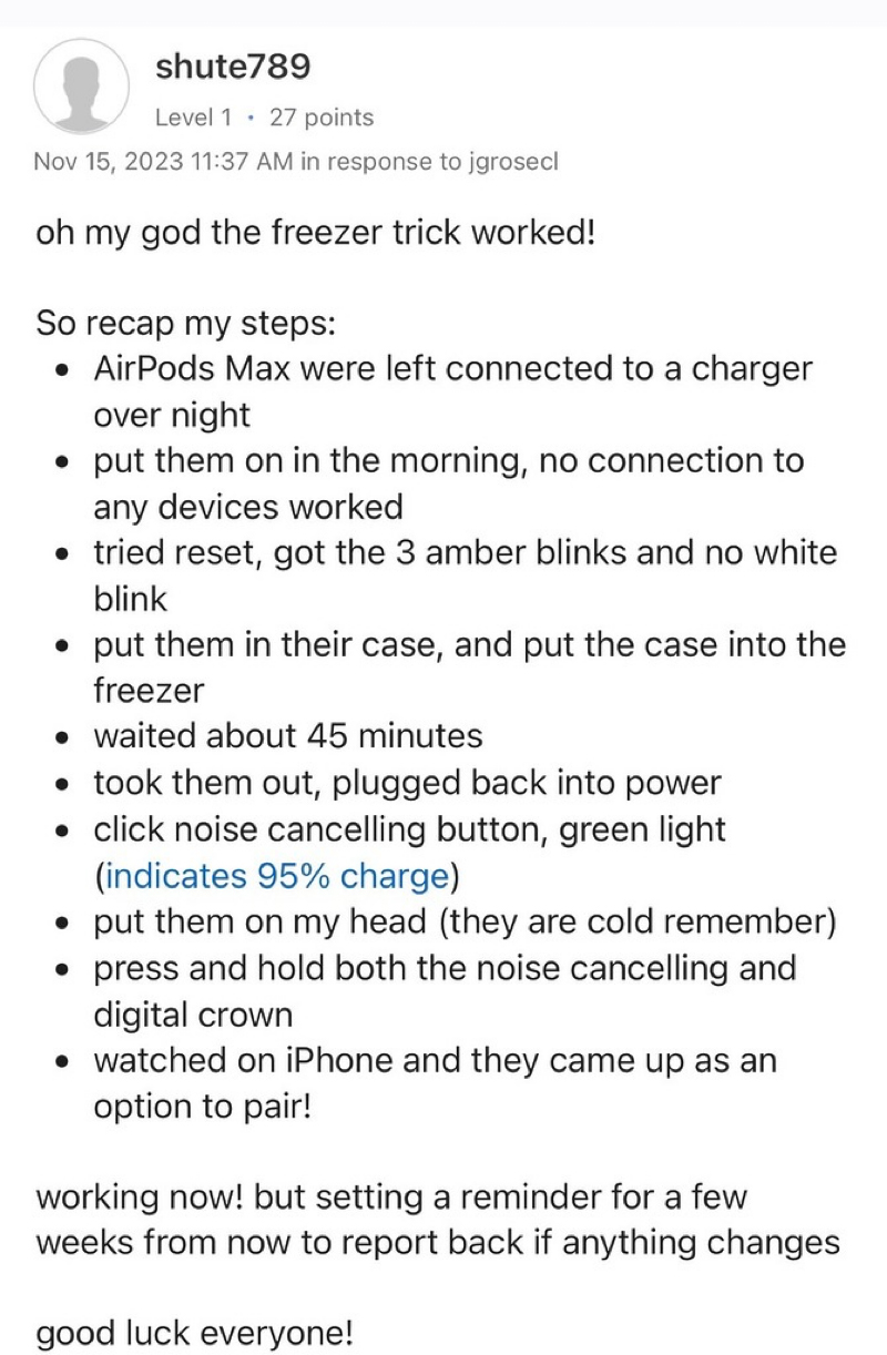 有產品維修人員指,AirPods Max 出現「三閃橘燈 (死機)」的狀況,很大機會是耳機內部電線經長期使用後出現斷裂並造成短路,而使用冷凍處理或可以令導線塑膠絕緣層收縮,暫時阻隔電線斷裂位的短路現象,讓通電恢復聲音與連線,但並無法真正「根治」問題,最終還是要送官方作檢查維修。