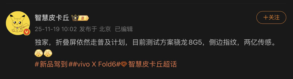 據數碼博主「智慧皮卡丘」在微博帳號透露,vivo 新一代大摺 X Fold6 手機,似乎會繼續以普及化計劃為產品定位,可預期裝置將保留較低入門價特色。