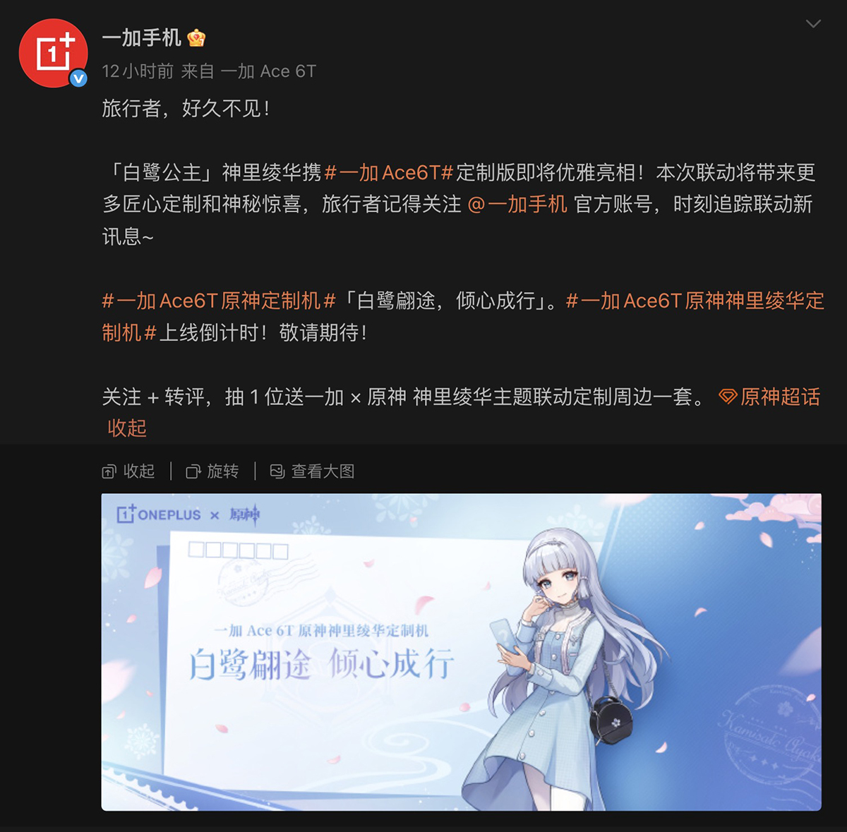 消息透露這次 OnePlus Ace 6T《原神》定制版本,將與遊戲中人氣角色「神里綾華」聯動,宣傳語句「白鷺翩途,傾心成行」,可預期會採雪白色調主題。
