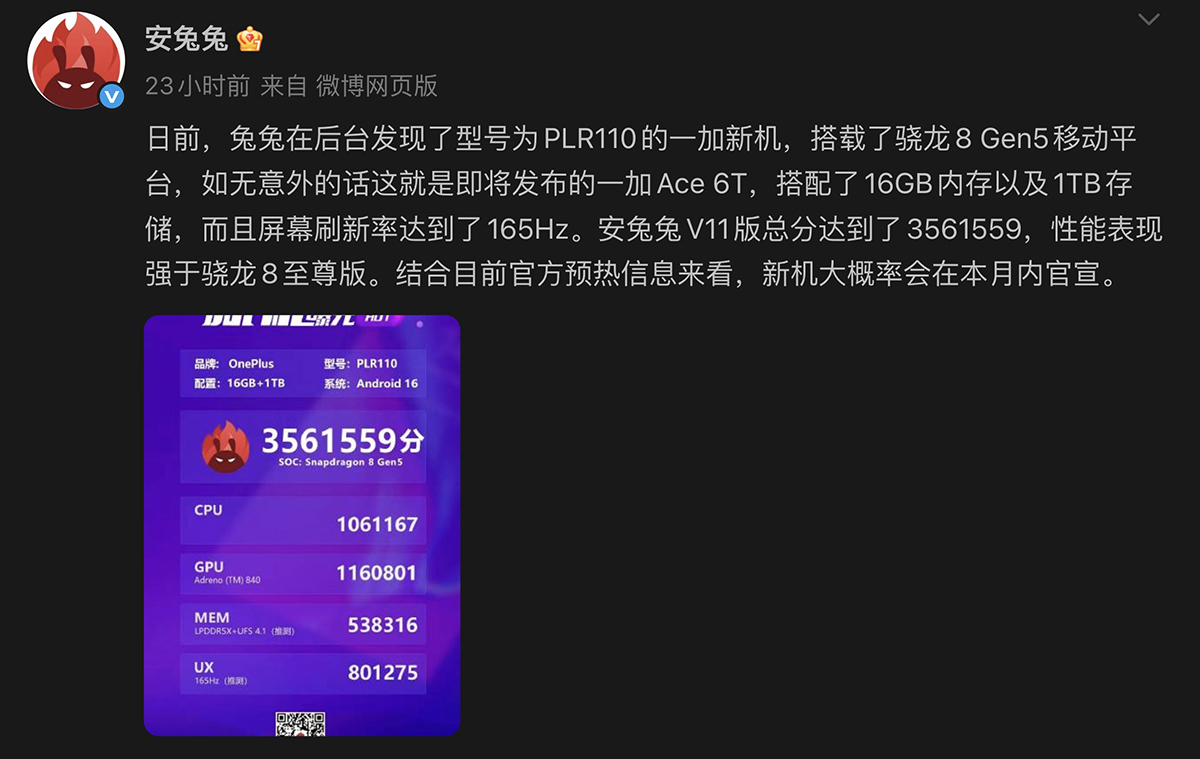 另外測試工具「安兔兔」微博帳號,又上傳了 OnePlus 型號 PLR110 手機測試成績,該款預計為 OnePlus Ace 6T 測試裝置,獲達 3,561,559 高分表現。