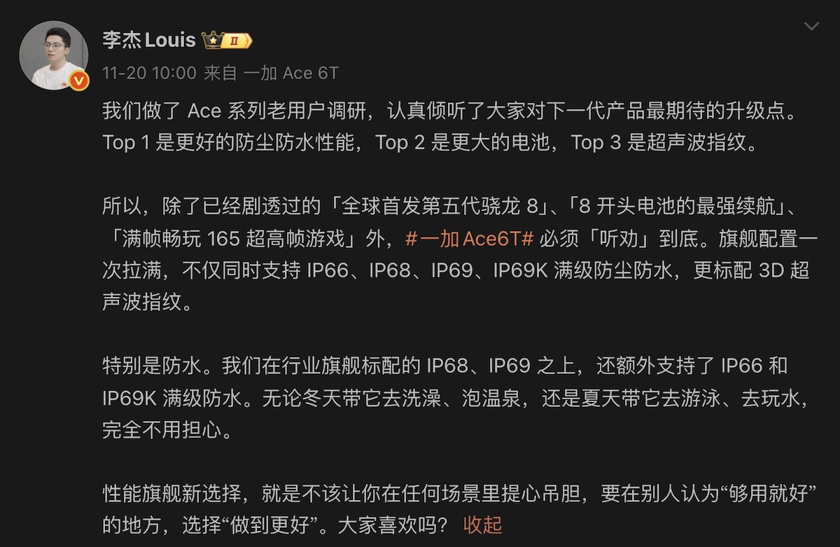 Mobile Magazine 短評:據品牌中國區總裁李杰透露,OnePlus Ace 6T 同時具 8K+ 大電池、165Hz 遊戲表現、達 IP69K 抗水防塵及超聲波指紋等功能。