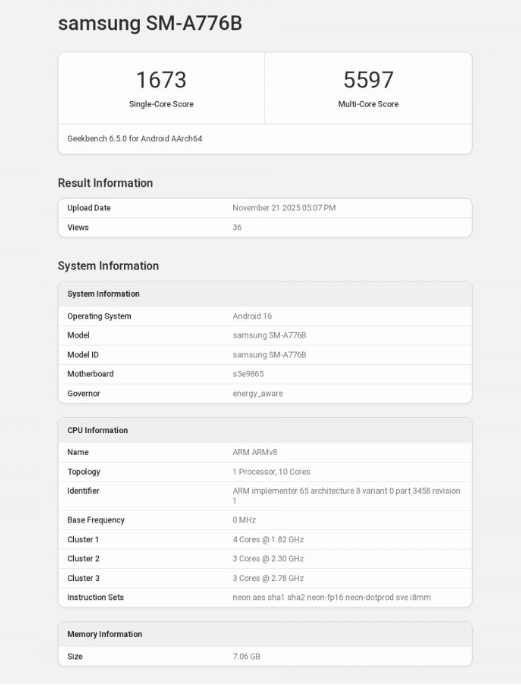 資料庫資訊顯示,這款 Galaxy A77 原型機配備了 8GB RAM,並預載了尚未正式發佈的 Android 16 作業系統。搭載與 SAMSUNG Exynos 2400 及 2400e 屬於同一系列的處理器,但從核心時脈配置來看,其定位明顯較為入門。