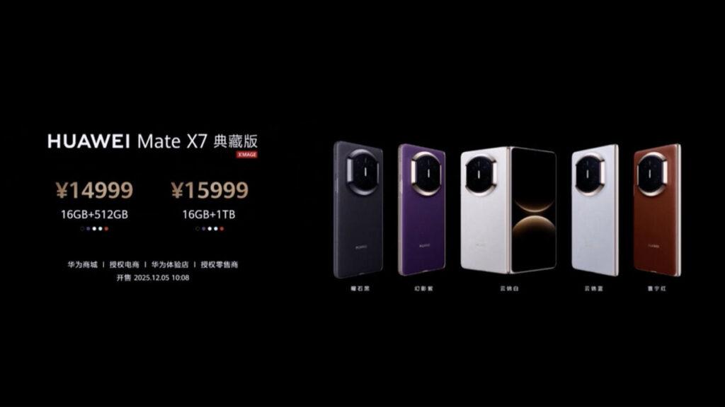 HUAWEI Mate X7 典藏版提供標準版相同五色,具 16+512 及 16+1TB 儲存款式,售價 14,999 人民幣(約港幣 $16,420)起,全系均附旋轉支架保護殼。