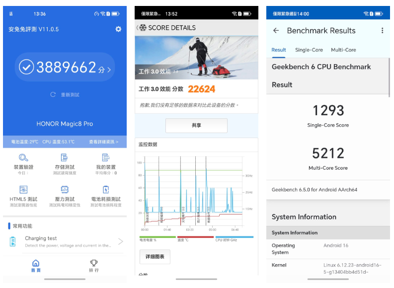 ▲系統效能方面,HONOR Magic8 Pro 用上現時頂級 Snapdragon 8 Elite Gen 5、LPDDR5X RAM 配 UFS 4.0 組合,於各項跑分屬頂級水平。