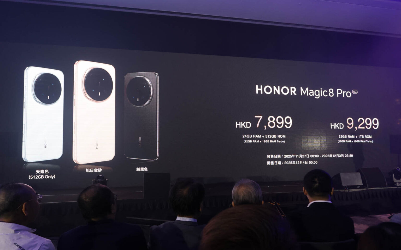 港版 HONOR Magic8 Pro 將具旭日金砂、天青及絨黑色款選擇、售價分別為港幣 $7,899(12+512)及 $9,299(16+1TB、旭日金砂 / 絨黑色)。