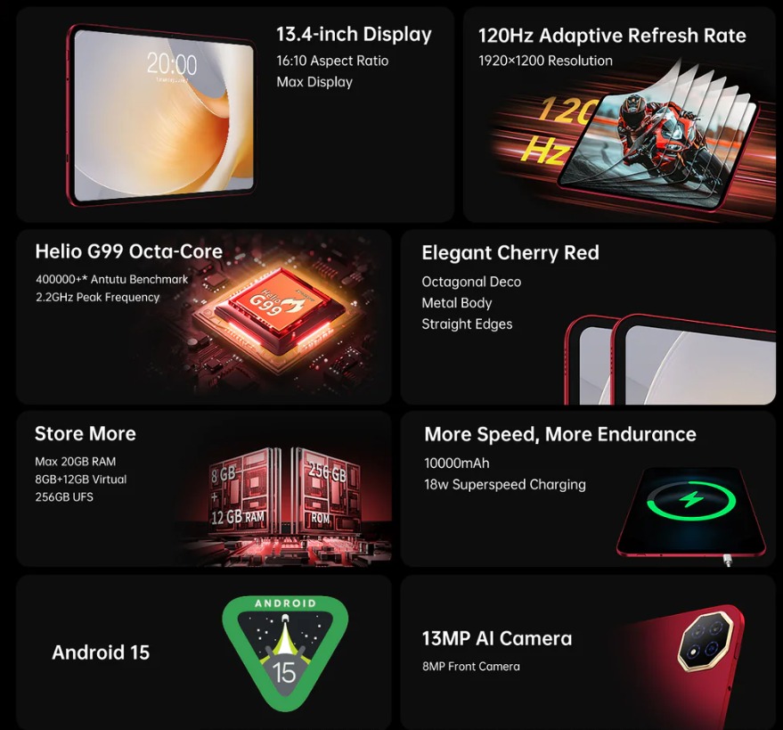 性能方面,T65 Plus 搭載 Helio G99 處理器,配備最高 20GB RAM(8GB + 12GB 擴展)與 256GB UFS 儲存空間,並可透過 microSD 卡擴充至 1TB,能輕鬆處理多工作業與各類應用程式。內建 10000mAh 大容量電池,支援 18W 快速充電,可滿足全天使用的電力需求。