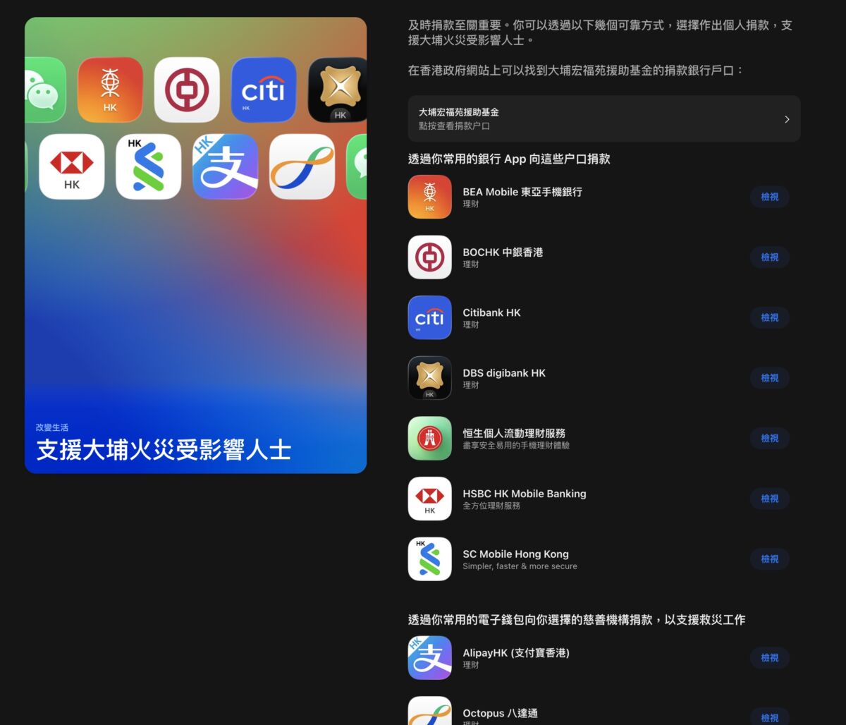 【MOBILE】較早前 Apple 在 App Store 專欄架設了大埔宏福苑援助基金捐款頁面,專頁內附香港政府大埔宏福苑援助基金網站鏈結,及常用銀行 / 支付 App 快捷鍵,方便市民登入及捐款。