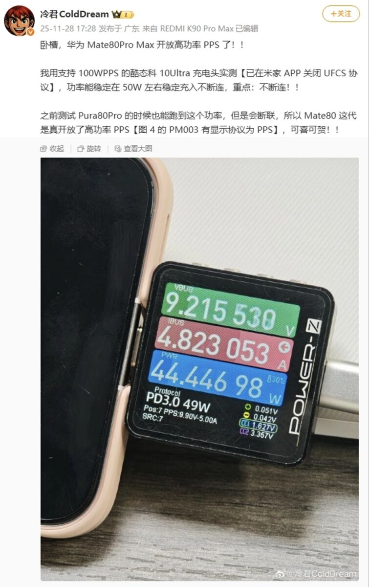 微博爆料者近日對 HUAWEI Mate 80 Pro Max 進行測試時,發現其搭載特殊的充電技術。這款頂規智慧手機支援 50W PPW 快充協議,能確保充電過程保持穩定且不受干擾。