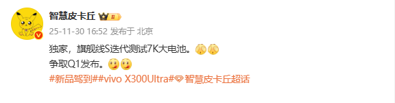 【MOBILE】近日有數碼博主爆料,某品牌S系列旗艦新機正在測試7000mAh級別大電池,從評論區及標籤推測,該機很可能為vivo X300s,預計將於明年第一季與vivo X300 Ultra同步亮相。
