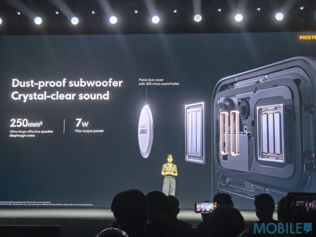 音效方面,POCO 與 BOSE 合作開發三揚聲器系統,機身背部配備超規格 2016 雙音圈揚聲器,透過增加音圈提升振膜面積,從而增強響度與聲壓,厚度減少 15%,響度提升 78%。低頻部分經過特別優化,補足 60 – 200Hz 頻段,使低音表現更加突出。實際試聽時,播放杜比全景聲影片可感受到強烈的聲音包圍感與方位感,低頻效果層次分明。