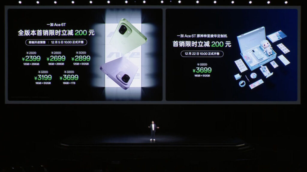 預計 12 月 5 日(週五)正式開賣的 OnePlus Ace 6T 手機,提供閃速黑、掠影綠及電光紫色款,具 12+256 / 12+512 / 16+256 / 16+512 / 16+1TB 五種配置。