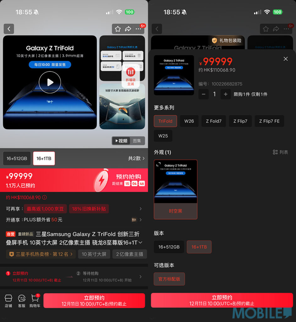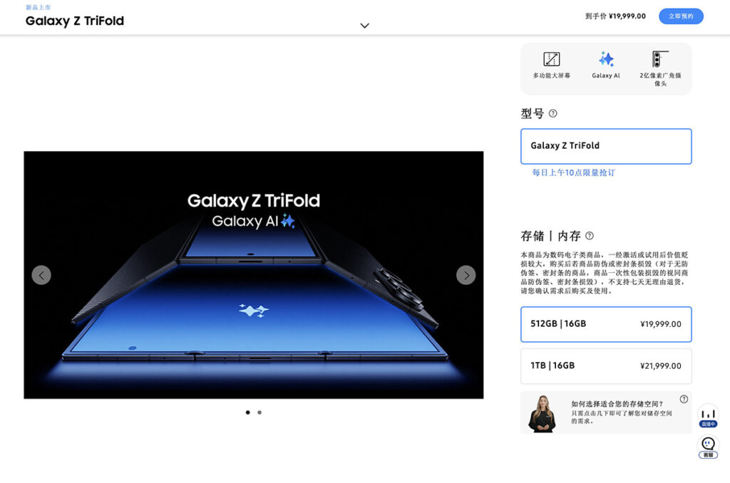 本文刊登時 Galaxy Z TriFold 國行版已開放預售,其統一提供時空黑色款,擁有 16+512 跟 16+1TB 雙儲存配置,售價由 19,999 人民幣(約港幣 $22,030)起。