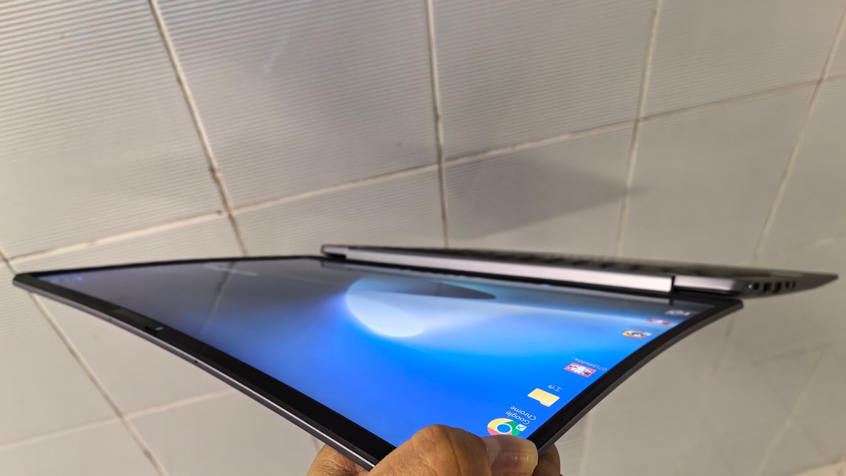 ASUS ExpertBook P5 符合 MIL-STD-810H 美國軍規標準,最高達 21 項測試項目,其轉軸與連接埠均經過強化設計。實際測試中,手握屏幕部分搖晃機身,屏幕與轉軸仍然沒有損壞,顯示這兩部分具備一定的結構彈性,能夠抵禦外部衝擊,不易因外力而斷裂。