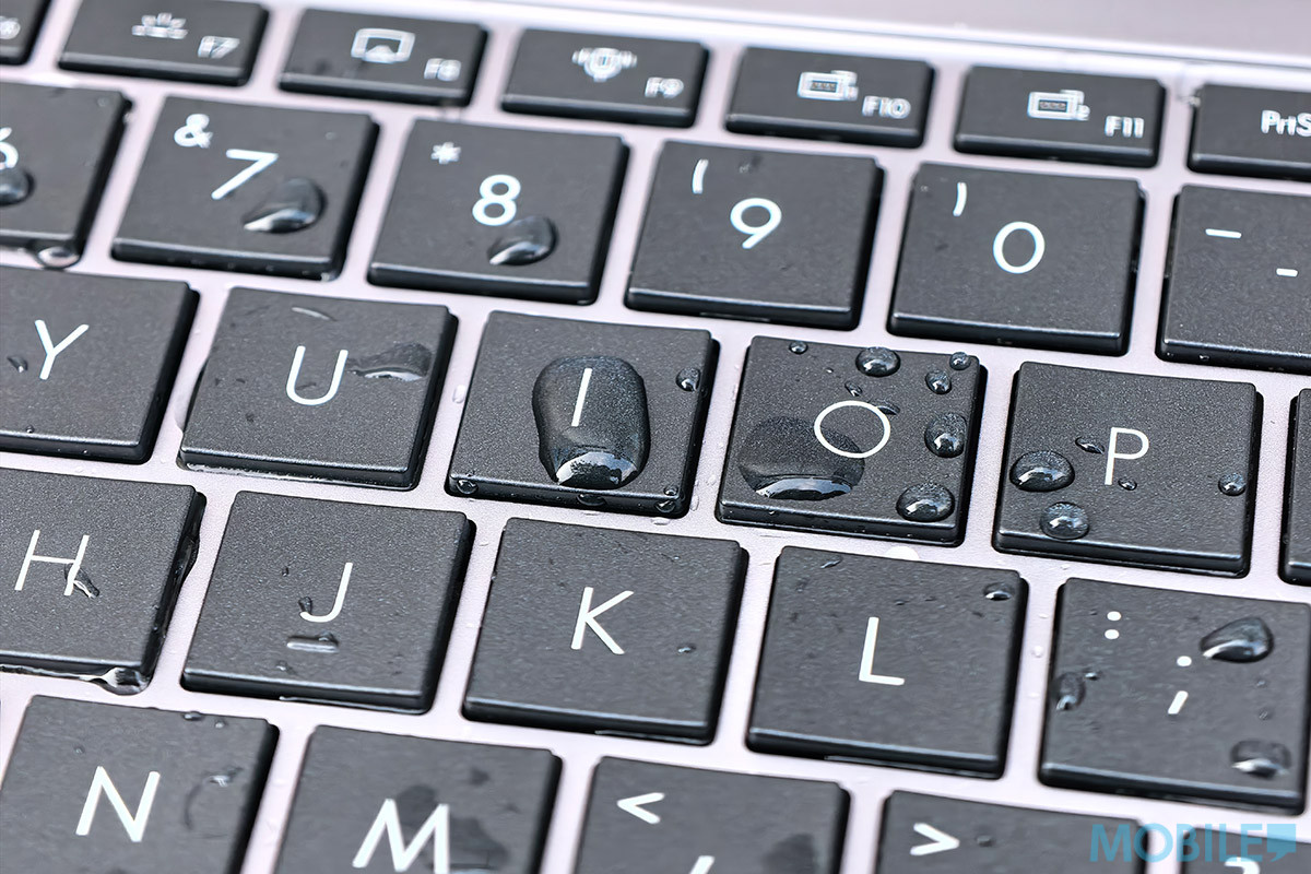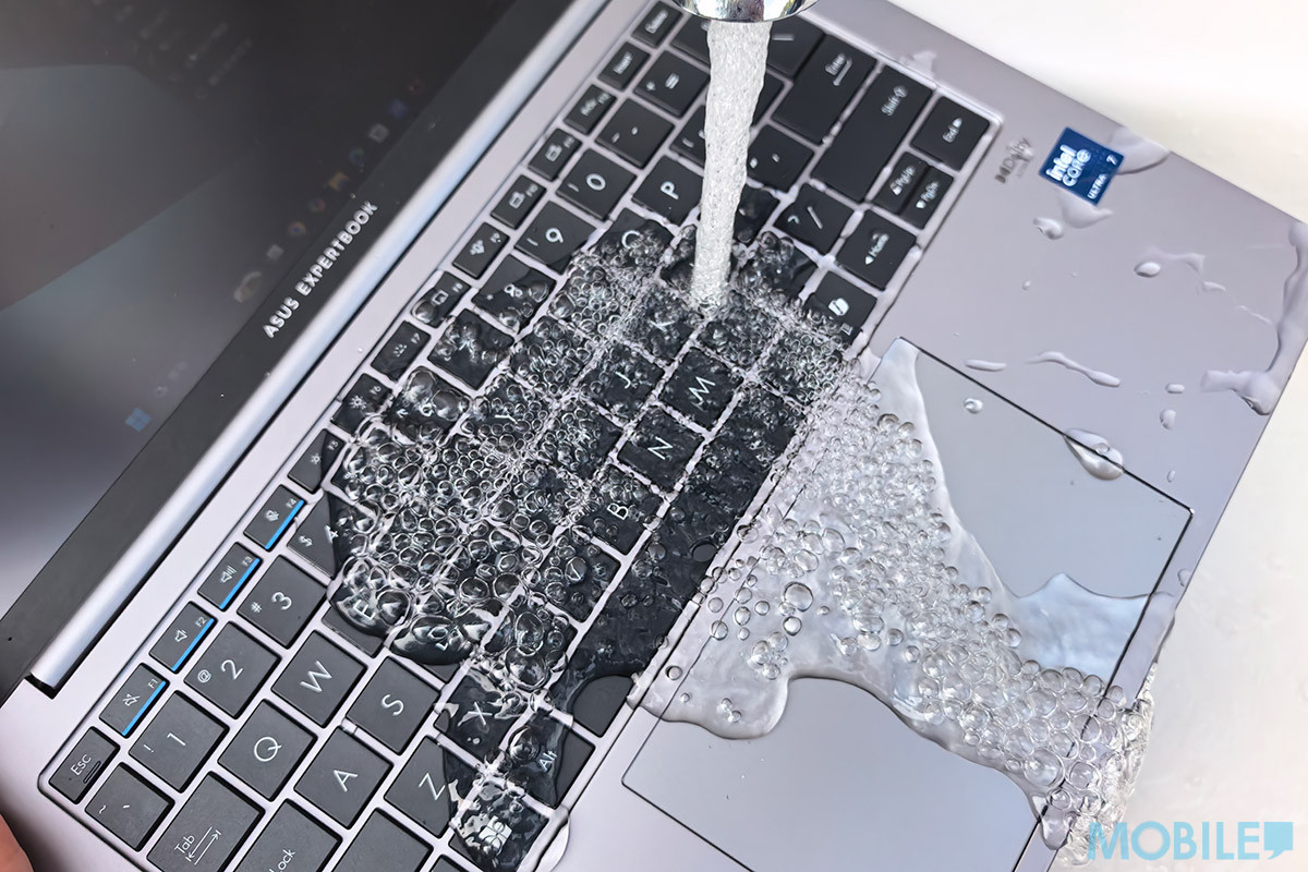 當前許多手機已具備一定程度的防塵抗水功能,但多數手提電腦一旦接觸液體(如打翻咖啡),便可能永久損壞。為驗證 ASUS ExpertBook P5 的鍵盤防潑水功能,我們直接以水流沖洗鍵盤一秒(官方標榜可抵禦 405 毫升液體),將鍵盤殘留水分震出後,設備仍然可以正常運作。