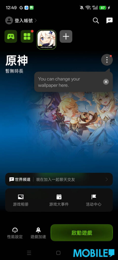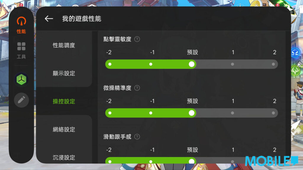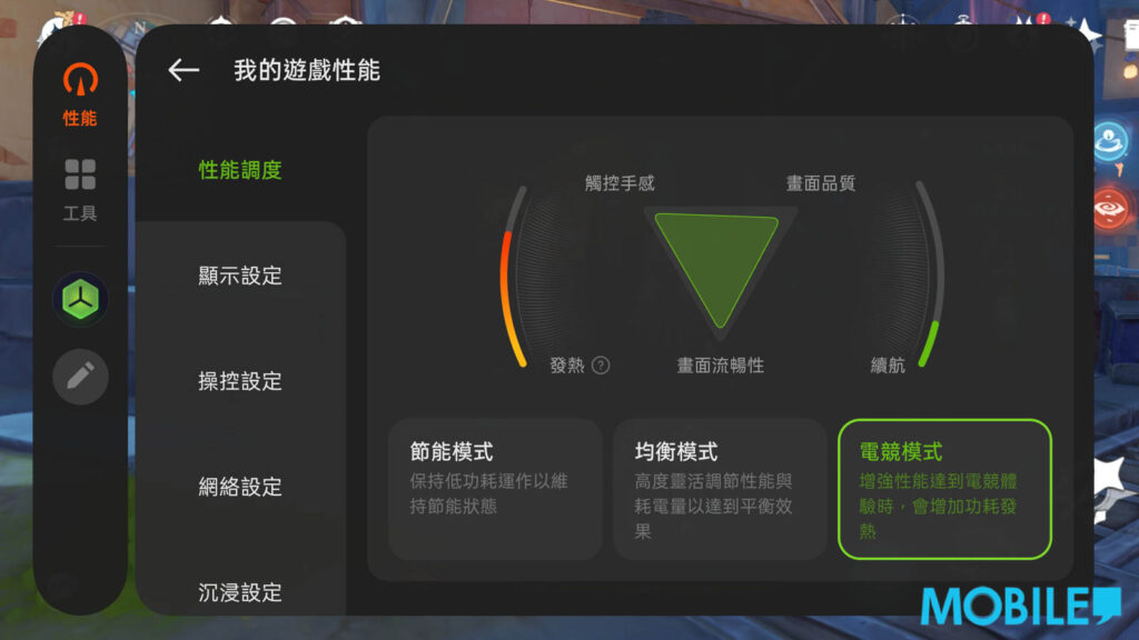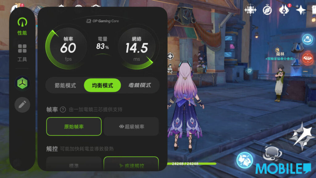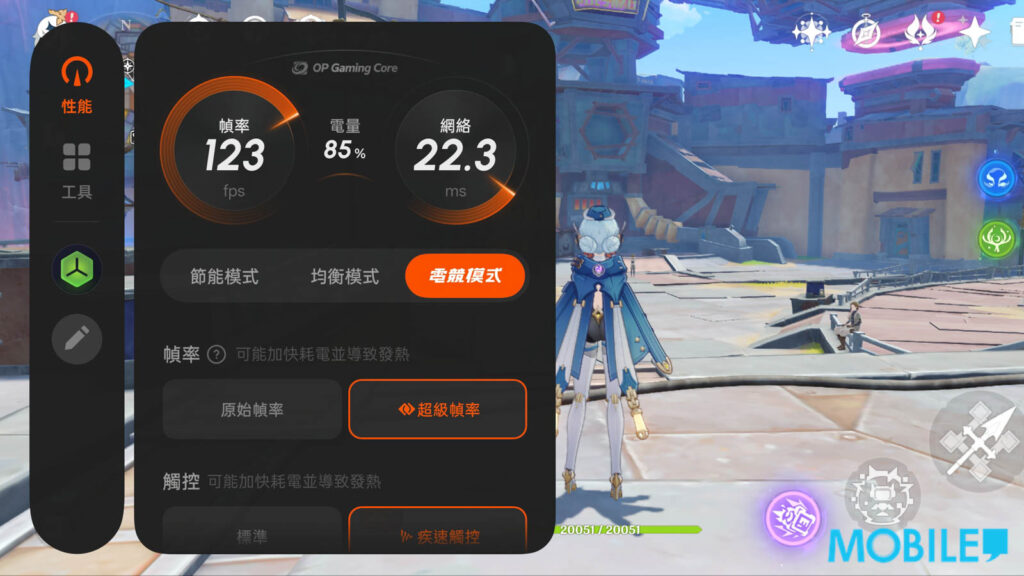 以 OnePlus Ace 6T 安裝《原神》試玩,可選從畫面左或右方拉出「遊戲助手」設定頁面,其預設三種效能模式,亦可按偏好設定觸控屏操作細節。