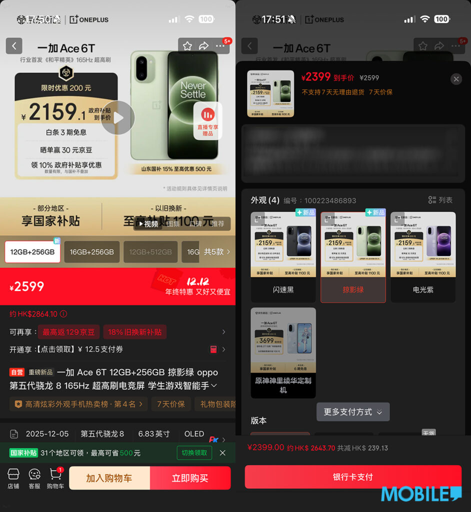 OnePlus Ace 6T 僅在國內銷售,不過在港用家就可透過電商平台入手,像京東港漠 App 品牌自營店,Ace 6T 標配 12+256 版本,包郵到港價約 HK$2,643.7 左右。