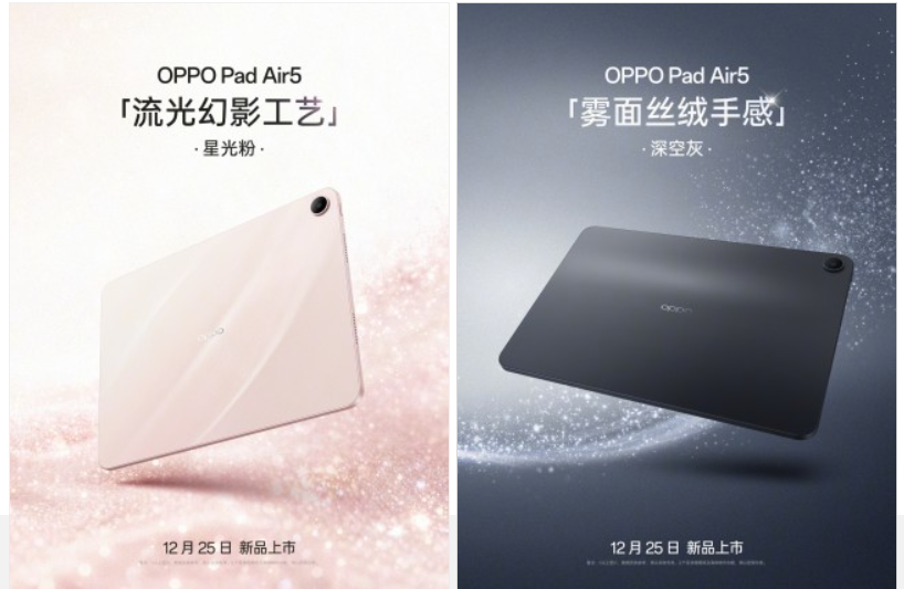 【MOBILE】OPPO 日前正式宣佈,將於 12 月 25 日全面發佈全新平板電腦 OPPO Pad Air5,並在發佈前率先公開了產品的部分設計細節與主要規格。從官方釋出的圖片可見,新平板採用簡約流線型設計,並提供兩種配色選擇,分別是星光粉與太空灰。