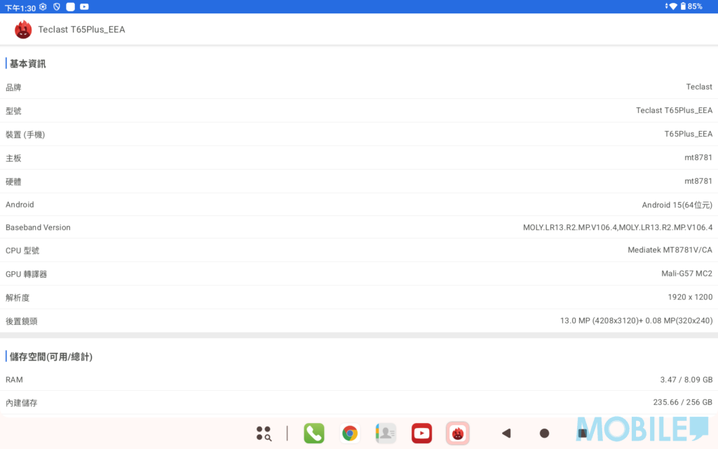 性能方面,T65 Plus 搭載 MTK Helio G99 處理器,配備最高 20GB RAM(8GB實體記憶體配合 12GB 擴展記憶體)與 256GB UFS 儲存空間。