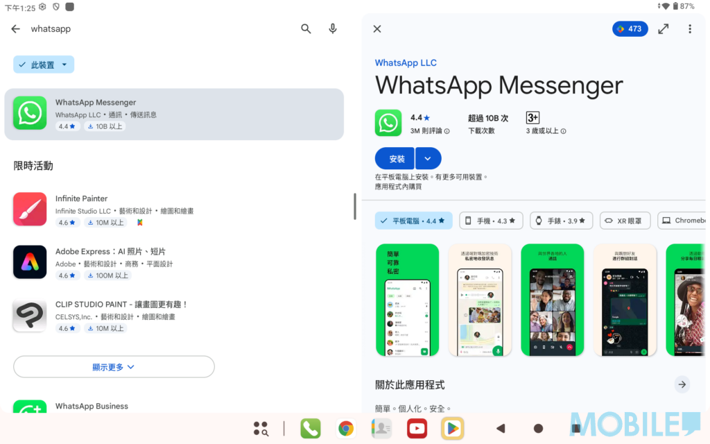 ▲而且於 Play 商店上,更可以直接安裝 WhatsApp 於平板上使用。