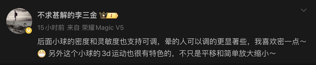 而據 HONOR 綠洲護眼產品經理「不求甚解的李三金」在微博提到,用家可覺個人需求增加或減少小球密度與靈敏度顯示,易暈 3D 用家可調高相關設定。