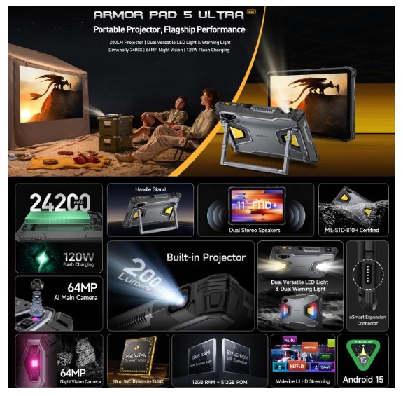【MOBILE】專注於推出強悍三防產品的 Ulefone,近日在香港市場正式推出全新平板電腦 Armor Pad 5 Ultra 5G。這款平板除了延續品牌一貫的高強度防護規格外,更整合了多項針對戶外工作與野營需求而設的獨特功能,當中包括內置投影機及兩萬毫安以上的超大容量電池,成為市場上功能最為多樣化的 5G 三防平板之一。
