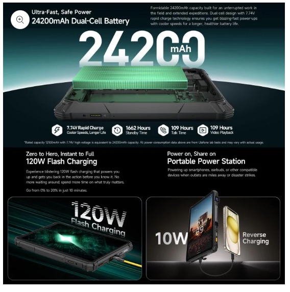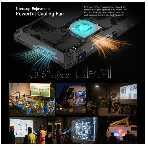 這款平板的最大賣點在於其極高的實用性,機頂位置內置了微型投影功能,方便用家在戶外或會議場合直接投影畫面。此外,機背設有專用的泛光手電筒,亮度高達 2,000 流明,並提供紅藍警示燈功能。為了支撐這些高耗電應用,Armor Pad 5 Ultra 5G 配備了高達 24,200mAh 的超大電池,並支援 120W 有線快充,同時具備反向充電功能,可以在必要時作為大型移動電源為手機或其他裝置供電。