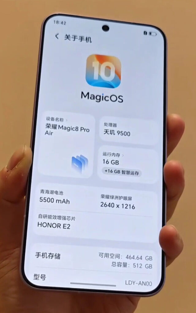 今次流出照片更透露,HONOR Magic8 Pro Air 將配備天璣 9500 晶片、螢幕具 2,640 x 1,216 像素,同時至少具備 16+512 儲存配置。