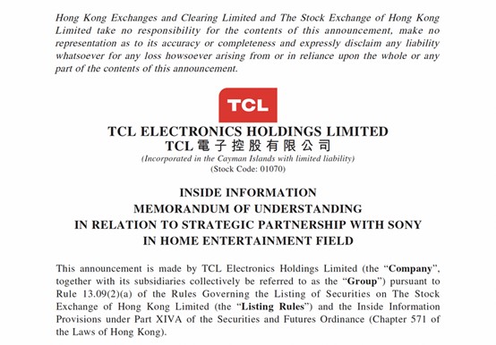 根據公告,雙方在 1 月 20 日收市後簽訂不具法律約束力的備忘錄,構思中的合資公司將承接 Sony 整個家用娛樂業務,由產品開發、設計、製造,以至全球銷售、物流及售後服務一手包辦,產品範圍涵蓋電視及家用音響等。合資公司未來推出的產品,預期會繼續沿用「Sony」及「BRAVIA」這兩個全球知名品牌名稱,再配合 Sony 多年累積的影像及音效技術、品牌價值和營運經驗。