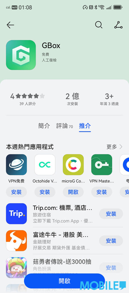 安裝後再於 AppGallery 搜尋及下載 GBox 工具,安裝後打開 Google Play 市場,按指示登入 Google 帳號即可正常使用及下載各 Android App。