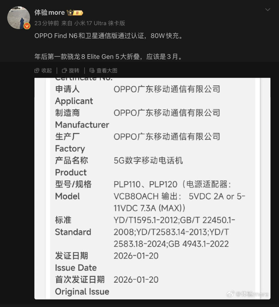 從流出截圖可看到,兩款 Find N6 手機型號分別為 PLP110 及 PLP120,其配備 VCB80ACH 充電器,支援 11V/7.3A 達 80W 閃充。