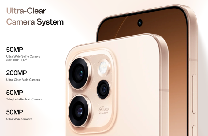 Reno15 系列的前置鏡頭具備 100° 視角,無需自拍棒即可納入更多人物或背景 。旗艦級的 Reno15 Pro Max 5G 則搭載 2 億像主鏡頭及 5000 萬像素潛望式望遠人像鏡頭,後者採用接近 85mm 的人像焦距,提供自然的背景虛化 。針對低光環境,系列加入「AI 閃光燈人像 2.0」,利用後置雙閃光燈與前置螢幕補光提升自拍光感 。