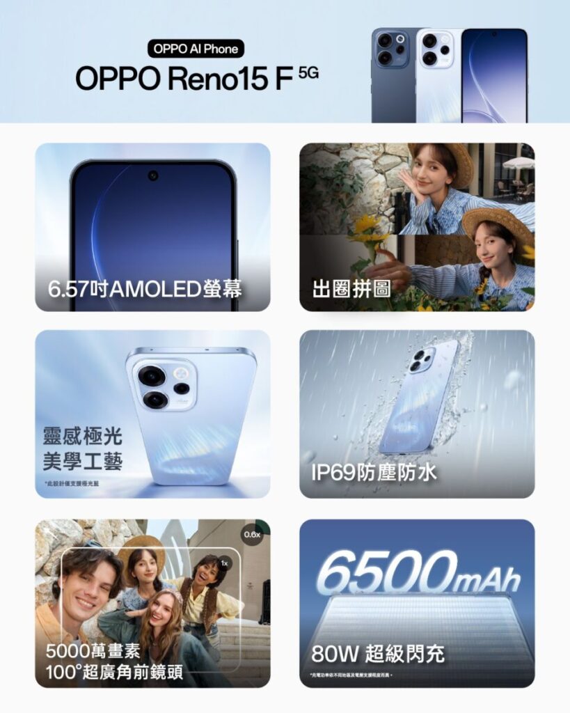 定價方面,OPPO Reno15 Pro Max 5G 提供 12GB + 512GB 版本,建議零售價為$4,499 。而 Reno15 F 5G 同樣配置 12GB + 512GB 記憶體,建議零售價為 $2,799 。兩款手機均提供多種色彩選擇。