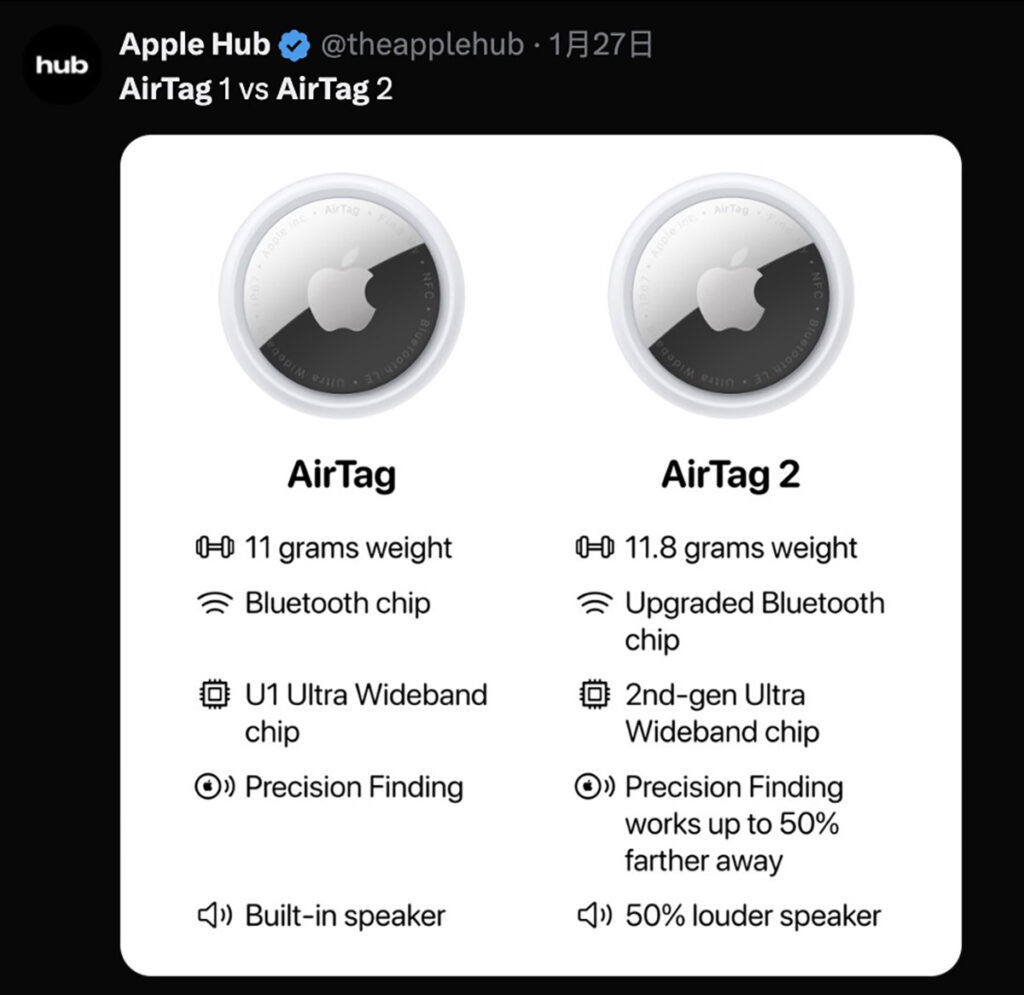 有外媒為此製作了 AirTag 功能圖,方便看清新舊兩代 AirTag 功能分別,如升級藍牙晶片、內置揚聲器音量調高達 50% 等。