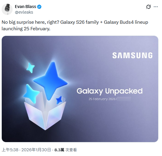 今次的消息來源於爆料達人 Evan Blass,他在社交平台上分享了一張據稱為 Galaxy Unpacked 的官方邀請函。圖片內容清晰顯示,SAMSUNG 計劃於 2026 年 2 月 25 日舉行這場發佈會。雖然官方目前尚未正式對外公布具體地點,但按照以往慣例,預計發表會仍會選址於國際主要城市同步進行全球直播。