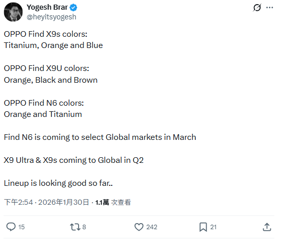 Mobile Magazine 短評:而筆者收到風,OPPO Find N6 國行版將於3月中發表,至於 Find X9 Ultra 就會於4月發表,有傳今年國際版推出時間將緊貼國行版一個月內推出!